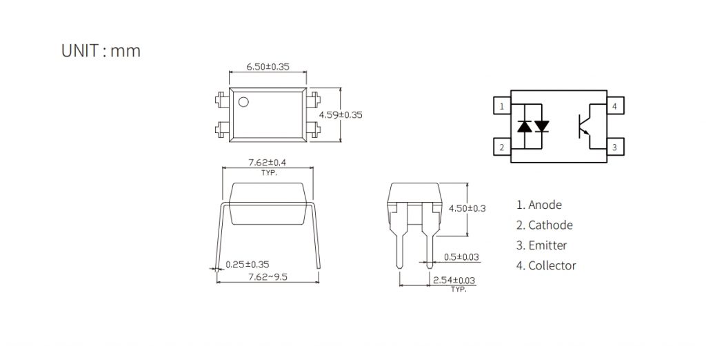 | Product | Package | size(LxWxHmm) | VF (V) | BV CEO (Min) (V) | V CE(SAT) (Max) (V) | IF (mA) | CTR (%) | tr (uS) | tf (uS) | ton (uS) | toff (uS) | Topr (Min) (degC) | Topr (Max) (degC) | Viso (Vrms) |