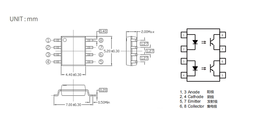 | KLD3H7 | SSOP8 | 4.4×5.2×2.0 | 1.2 | 80 | 0.2 | 5 | 50-600 | 5(Typ) | 3(Typ) | - | - | -55 | +110 | 3750 |